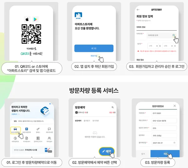 입주민은 아파트스토리 앱을 통해 방문차량 예약을 할 수 있습니다.