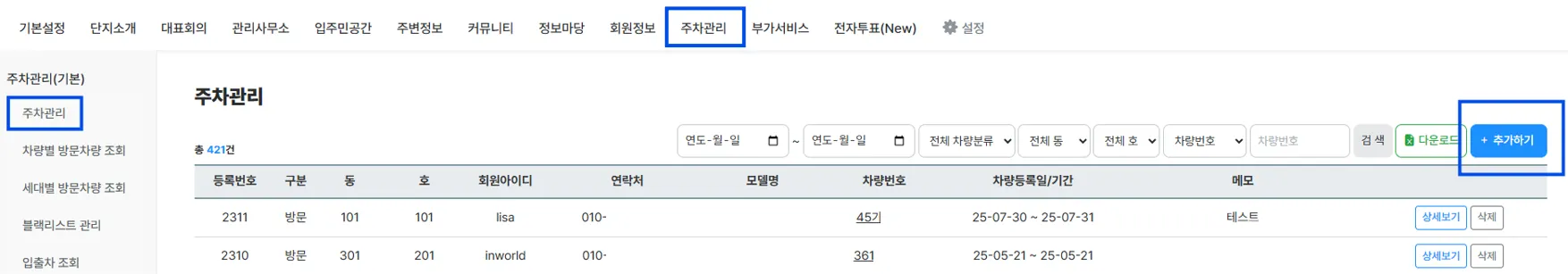 관리 매니저가 직접 입주/방문/외부 차량을 등록할 수 있습니다.