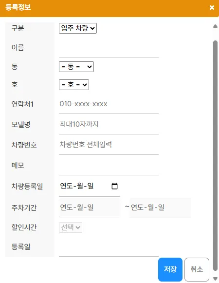 등록 경로 : 관리자페이지 → 주차관리 → 추가하기 → 등록정보 입력