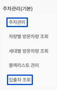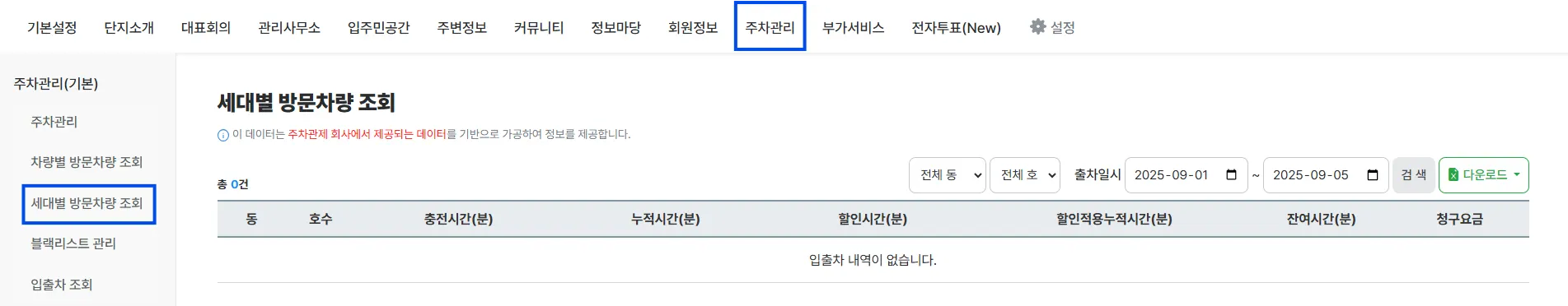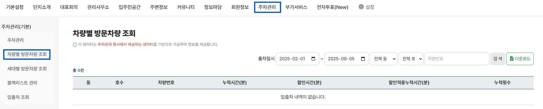 방문차량 조회는 세대별 / 차량별로 확인할 수 있으며, 조건 검색 후 데이터를 확인하고 엑셀 다운로드