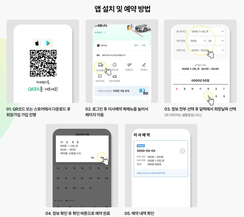 회원가입 → 2. 관리사무소 승인 → 3. 로그인 → 4. 입주민공간 → 5. 이사예약
