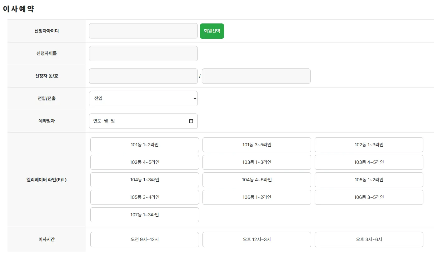 입주/이사 예약 서비스 (관리자 페이지 →입주민공간 → 이사예약)