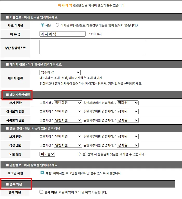 중복 예약 허용 여부: 필요 시 체크하여 동일 세대에서 여러 건 예약 허용